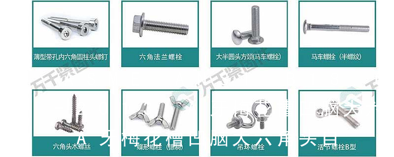 1.机螺钉 2.自攻螺钉 3.钻尾螺钉 4.墙板钉 5.纤维板钉 6.木螺钉7.六角木螺钉 8.不脱出螺钉 9.组合螺钉 10.微型螺钉 11.家具螺钉 12.电子螺钉头型:1.六角头(hexagon head) 2.六角头法兰面(hexagon head with flange) 3.